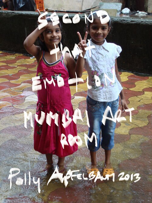 The title of this show, Second That Emotion, springs from the image used for the exhibition poster of two Bombay kids, Vishaka Malode and Tanushri Tandel, flashing peace signs during the 2011 monsoon, grinning while standing ankle-deep in fresh rainwater outside the Mumbai Art Room. It simultaneously refers to Smokey Robinson and the Miracles' song from the sixties, "I Second That Emotion," and perhaps most importantly, invites the audience to reaffirm this exuberant abstraction.